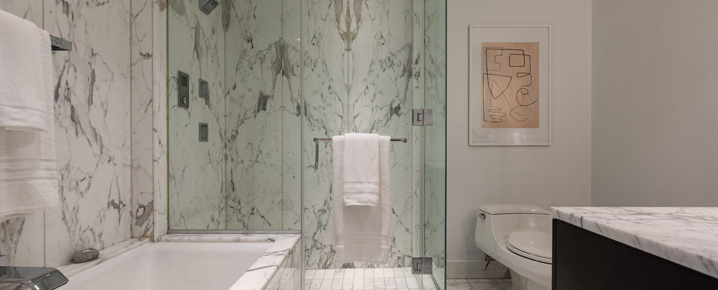 A walk-in closet offers practical and well-organised storage space, while the ensuite bathroom feels like a private spa. Finished in elegant marble, this four-piece retreat features heated floors, a deep soaker tub, and a seven-head Kohler DTV shower system—designed to provide a truly immersive, personalised experience. Every element, from lighting to temperature control, has been thoughtfully selected to enhance comfort and luxury.